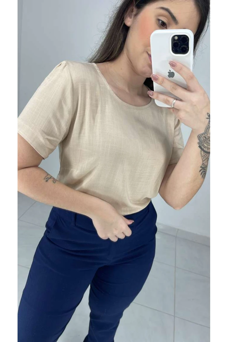 Esta blusa confeccionada em viscolinho com elastano oferece um equilíbrio perfeito entre elegância e conforto. O busto arredondado proporciona um caimento suave e clássico, valorizando a silhueta de maneira discreta. As mangas curtas adicionam frescor e leveza ao design, tornando a peça ideal para o dia a dia.