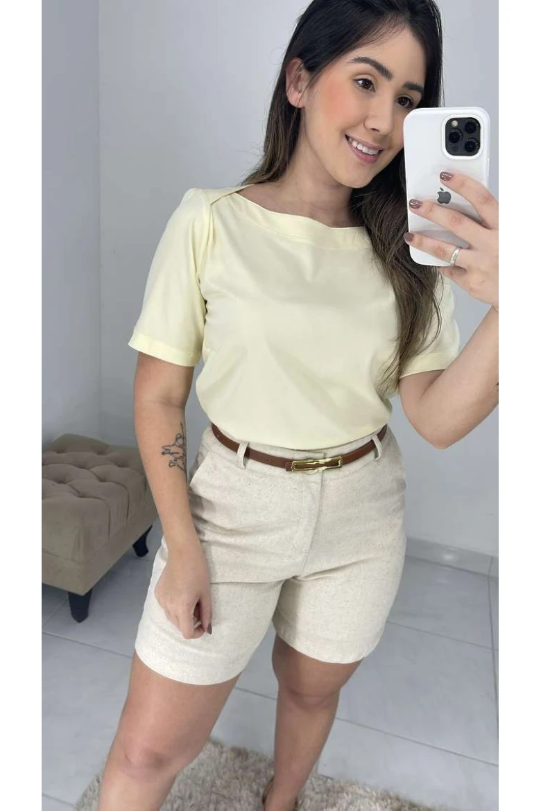 Conforto e estilo em uma peça só. Confeccionada em viscose com elastano, essa blusa de manga curta oferece toque macio e caimento leve, além de proporcionar liberdade nos movimentos. O decote canoa valoriza o colo com delicadeza, trazendo um charme sutil à peça. Perfeita para composições casuais ou sofisticadas, conforme os acessórios.